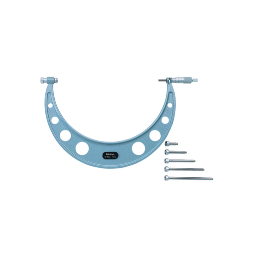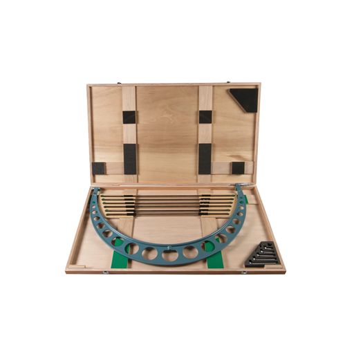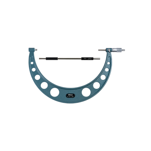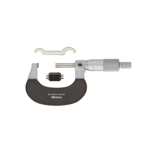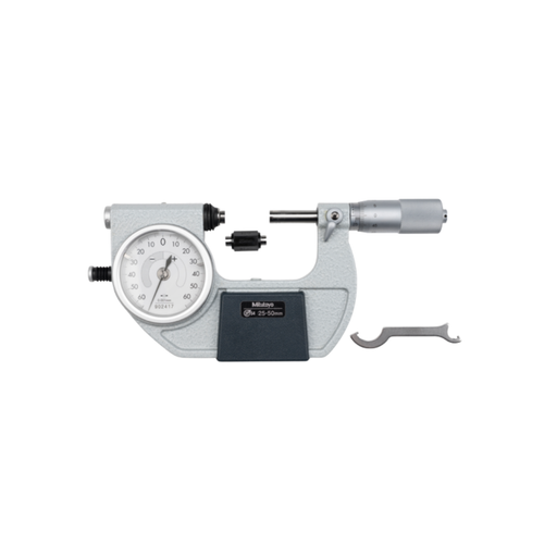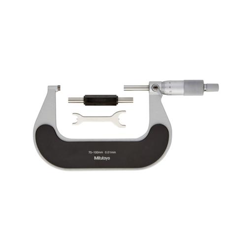 Un micrómetro no digital Mitutoyo provisto de topes fácilmenteintercambiables para permitir un amplio intervalo de medición desde un solo instrumen...
