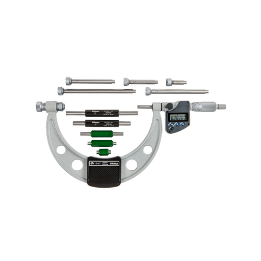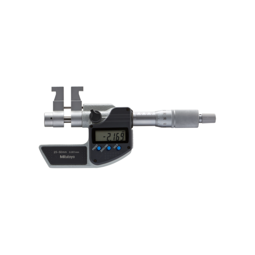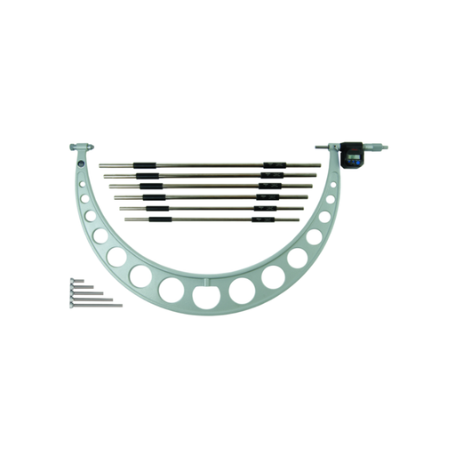 Micrómetro digital Mitutoyo provisto de topes fácilmente intercambiables para permitir un amplio intervalo de medición desde un solo instrumento. U...