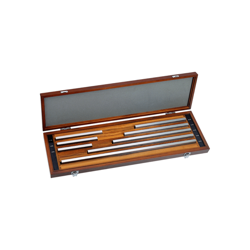 Un equipo de prueba de micrómetros exteriores de Mitutoyo que comprende diez bloques patrón para probar la precisión a lo largo de la carrera de me...